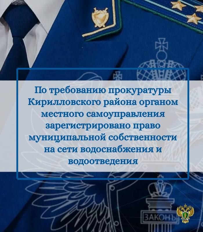 Проверкой установлено, что на территории г. Кириллова эксплуатируется объект жилищно-коммунальной инфраструктуры, обеспечивающий водоснабжение и водоотведение двух жилых домов, на который в установленном законном порядке не было зарегистрировано право...