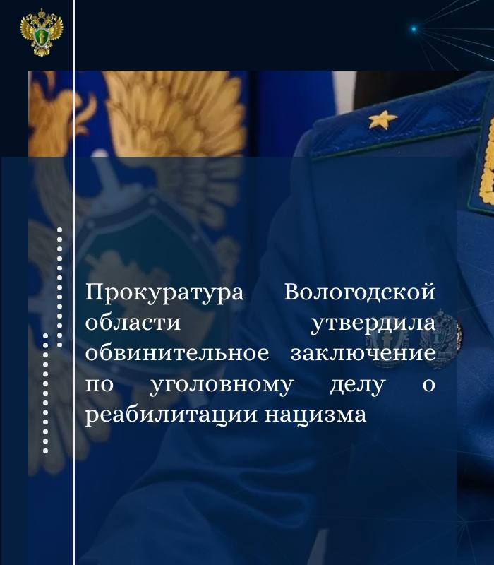 Прокуратура Вологодской области утвердила обвинительное заключение по уголовному делу в отношении 64-летнего местного жителя. Он обвиняется по ч. 1 ст. 354.1 УК РФ (реабилитация нацизма).