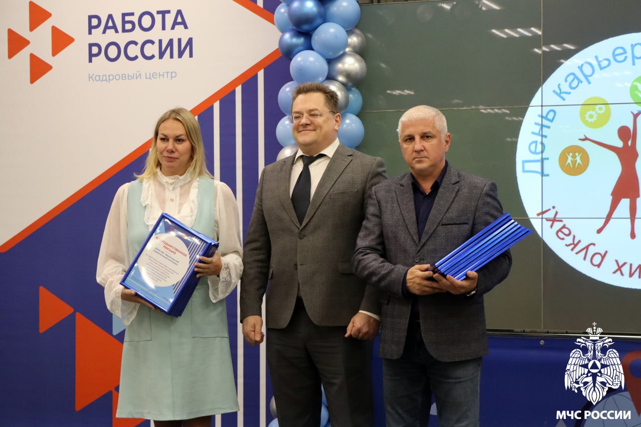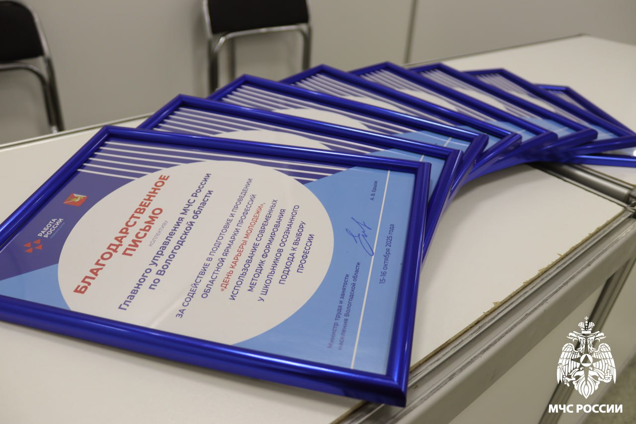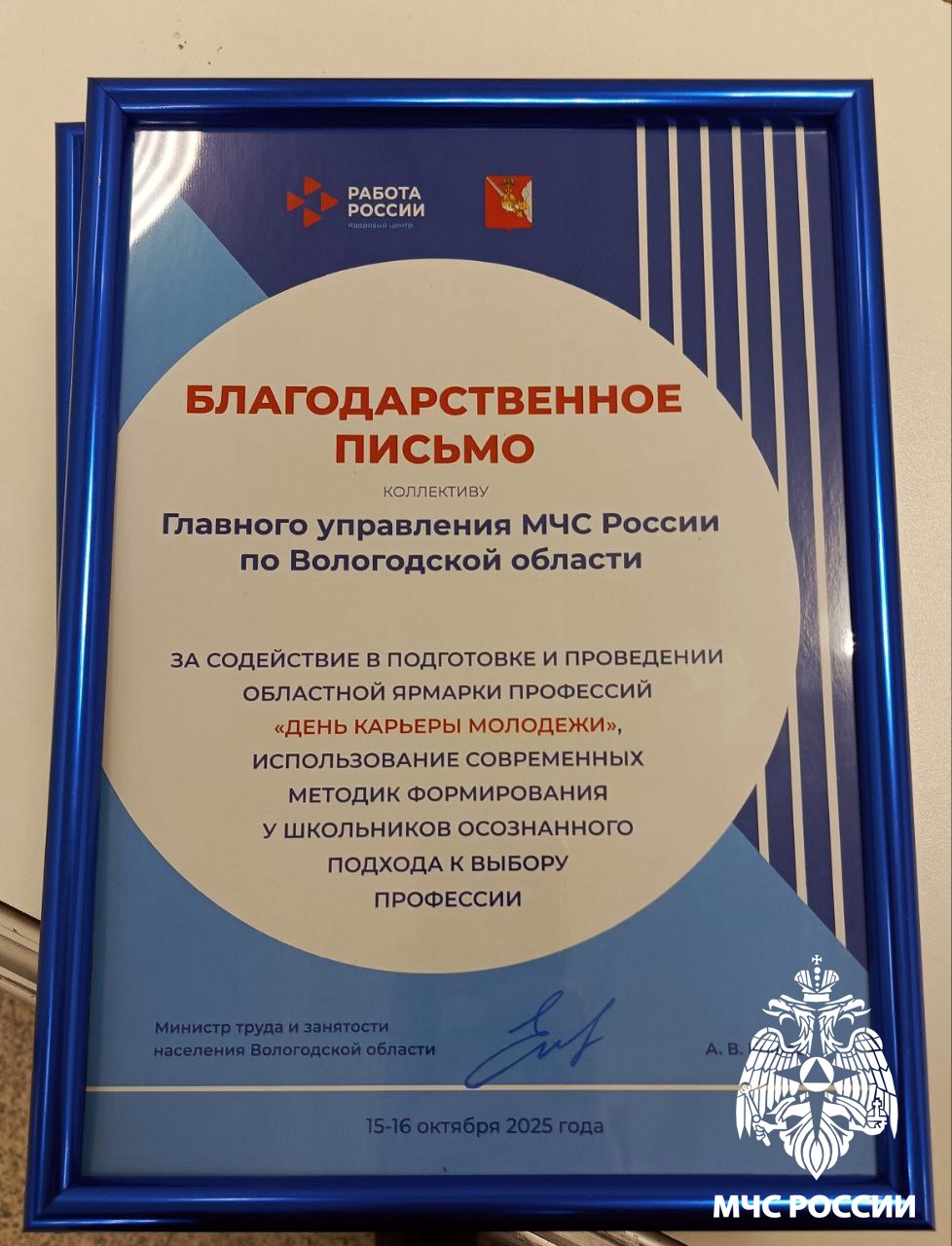 Сегодня, в заключительный день ярмарки, состоялось торжественная церемония закрытия. За содействие в подготовке и проведении областной ярмарки профессий «День карьеры молодёжи» специалисты МЧС России были отмечены благодарственными письмами Министерства труда и занятости населения Вологодской области.