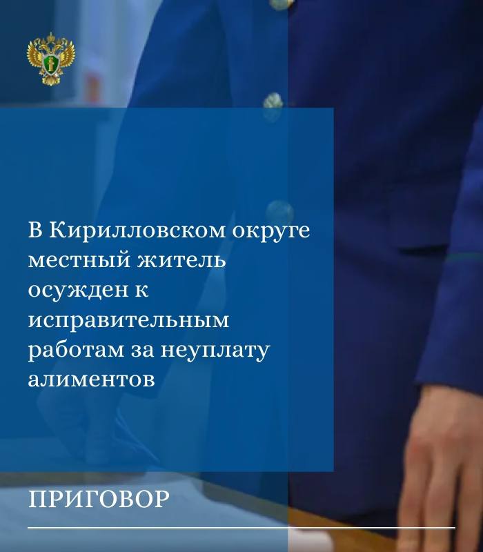 Прокуратурой Кирилловского района поддержано государственное обвинение по уголовному делу в отношении 33-летнего жителя г. Кириллова. Судом он признан виновным по ч. 1 ст. 157 УК РФ (неуплата родителем без уважительных причин средств на содержание несовершеннолетних детей).