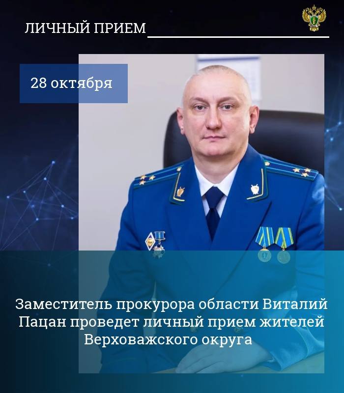 Заместитель прокурора Вологодской области Виталий Пацан 28 октября 2025 года проведет личный прием жителей Верховажского округа.