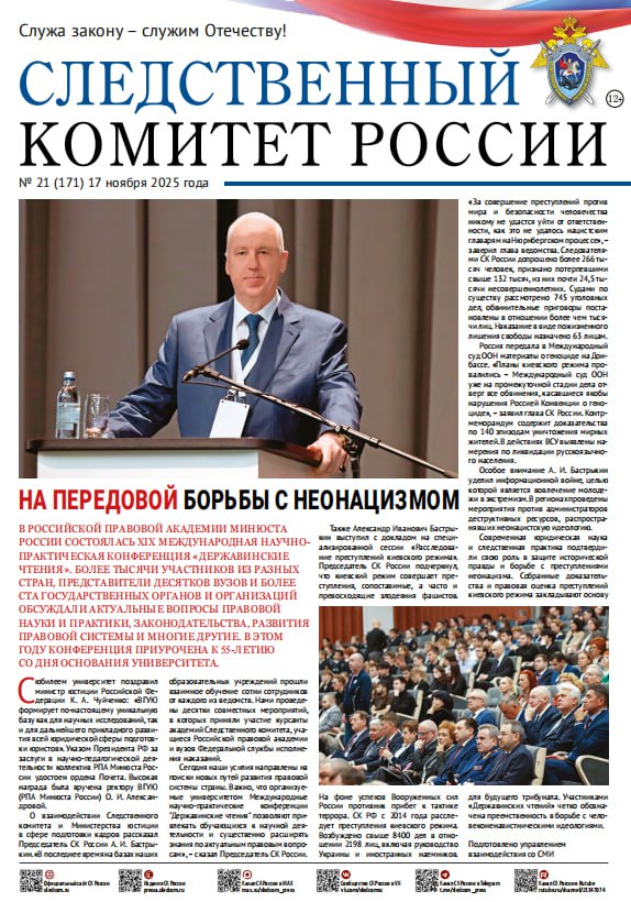 На официальном сайте Следственного комитета Российской Федерации в разделе «Издания Следственного комитета России» размещена электронная версия свежего выпуска ведомственной газеты "Следственный комитет России" № 21 (171) от 17 ноября 2025 года.