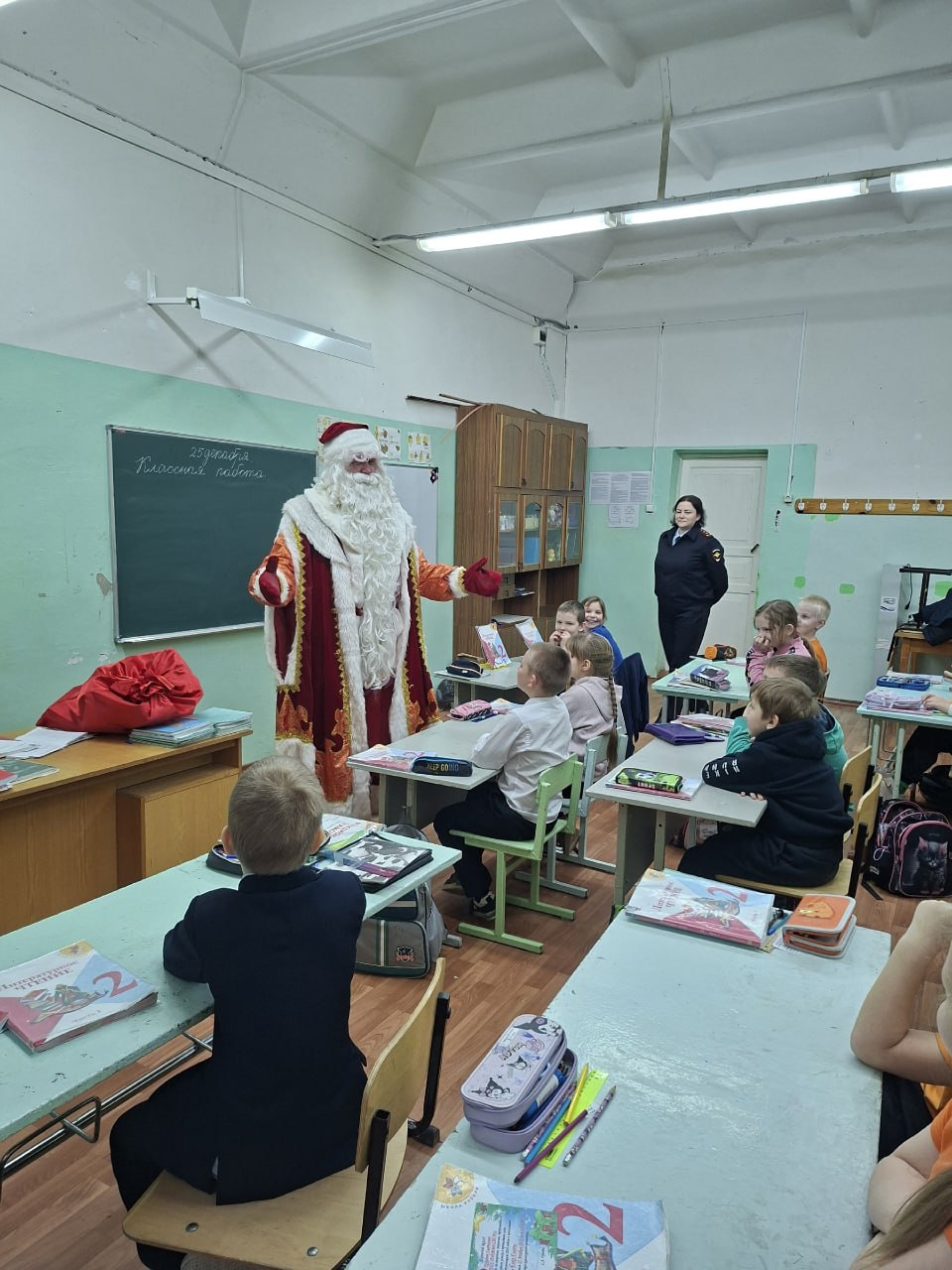 Александр Юрьевич выступил в роли зимнего волшебника. Полицейский Дед Мороз поздравил учащихся с наступающим новым годом. В свою очередь дети пообещали хорошо учиться и быть дисциплинированными.