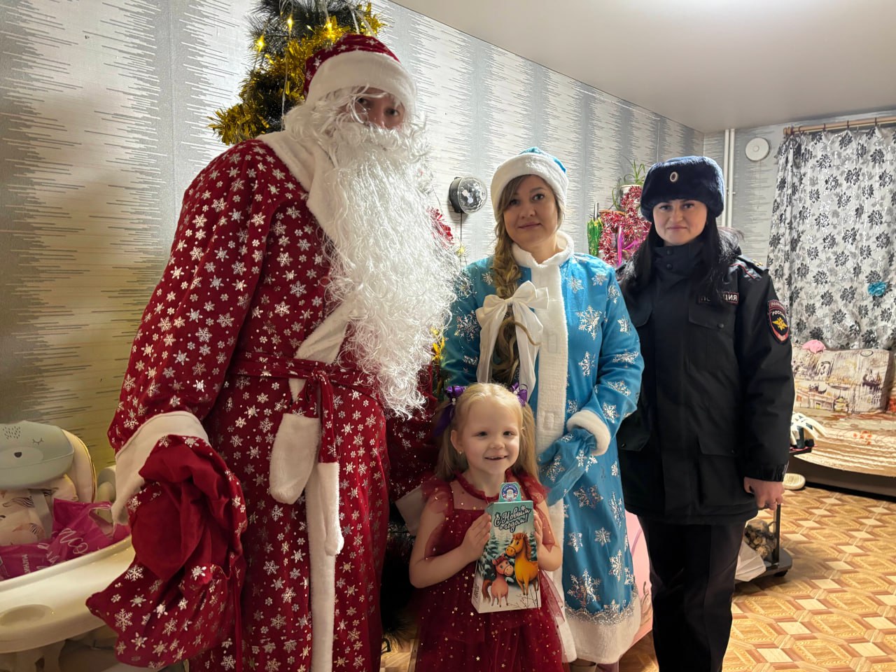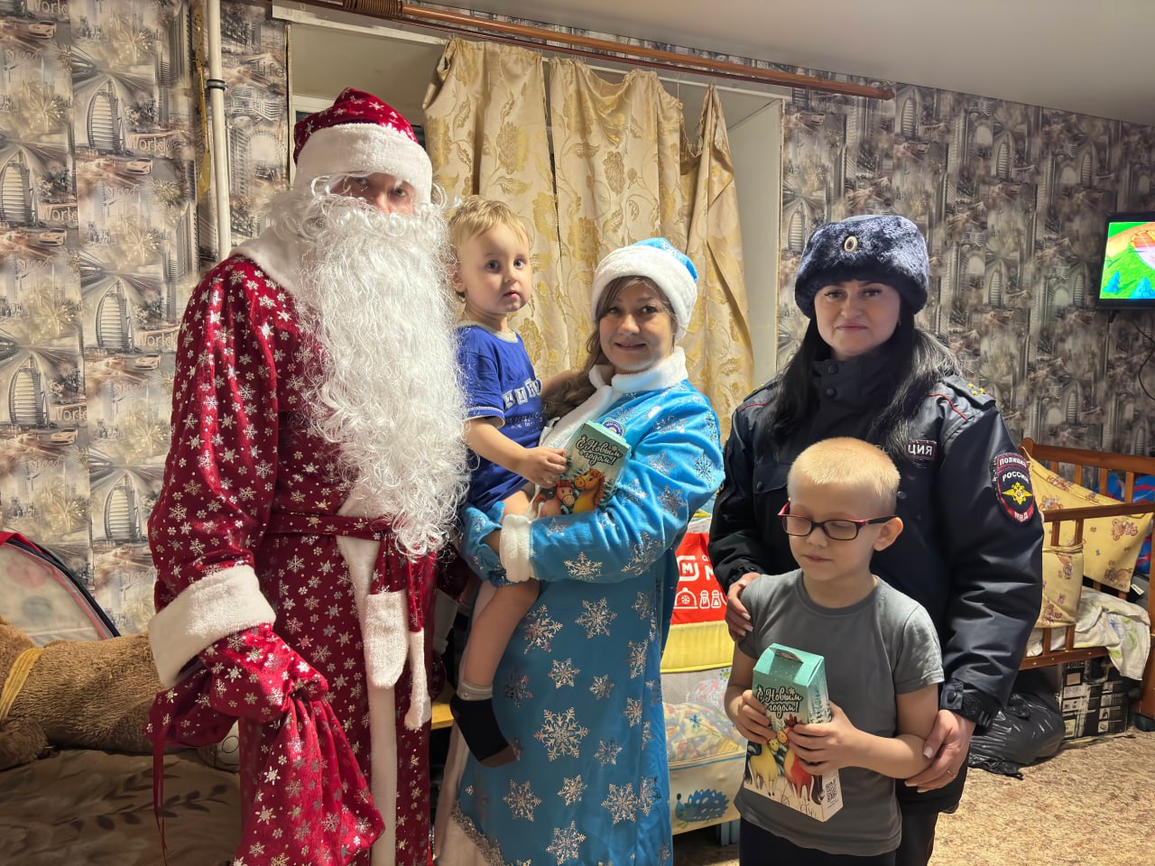 Сотрудники ПДН и участковые уполномоченные полиции подготовили для детей сладкие подарки и теплые поздравления. Полицейские перевоплотились в сказочных персонажей и отправились в гости к ребятам, где вручили подарки и призвали соблюдать правила безопасного поведения в период зимних каникул.