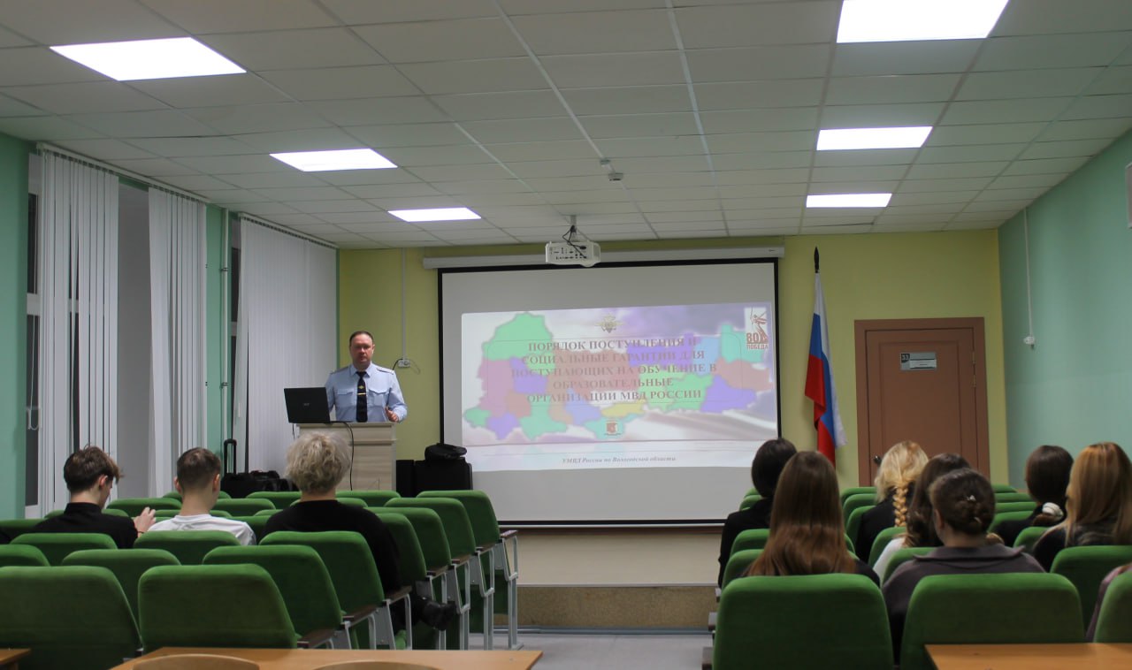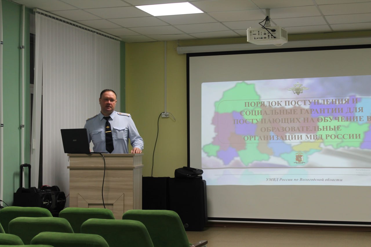В ходе встречи Александр Николаевич рассказал будущим выпускникам о порядке поступления в вузы системы МВД России, особенностях учебного процесса и различных направлениях деятельности полицейских, о требованиях, которые предъявляются к кандидатам, решившим поступать в учебные заведения МВД России. Ребята узнали, что при отборе кандидатов на службу в МВД особое внимание уделяется их образованию, морально-волевым и деловым качествам, состоянию здоровья и физической подготовке, а также узнали о социальных гарантиях, которые государство предоставляет полицейским. Сегодня это полное государственное обеспечение, льготы, бесплатное получение высшего образования, денежное и полное вещевое довольствие курсанта, проживание в общежитии, оплачиваемый отпуск по окончании каждого курса с бесплатным проездом к месту жительства и т.д. Лица, окончившие образовательные организации МВД, получают диплом о высшем образовании государственного образца, им присваивается звание «лейтенант полиции» и они обеспечиваются работой в органах внутренних дел.