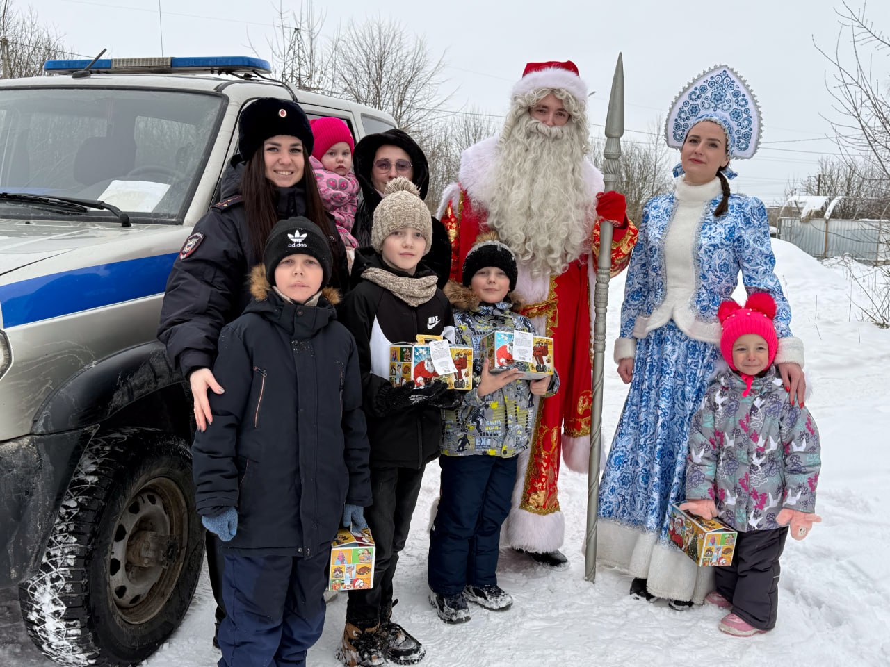В рамках профилактической акции «Полицейский Дед Мороз» главные зимние волшебники из ОМВД России «Шекснинский» посетили ребят поселка. Дети очень радовались встрече с волшебниками, рассказывали стихи и пели песни, после чего получили заслуженные подарки.