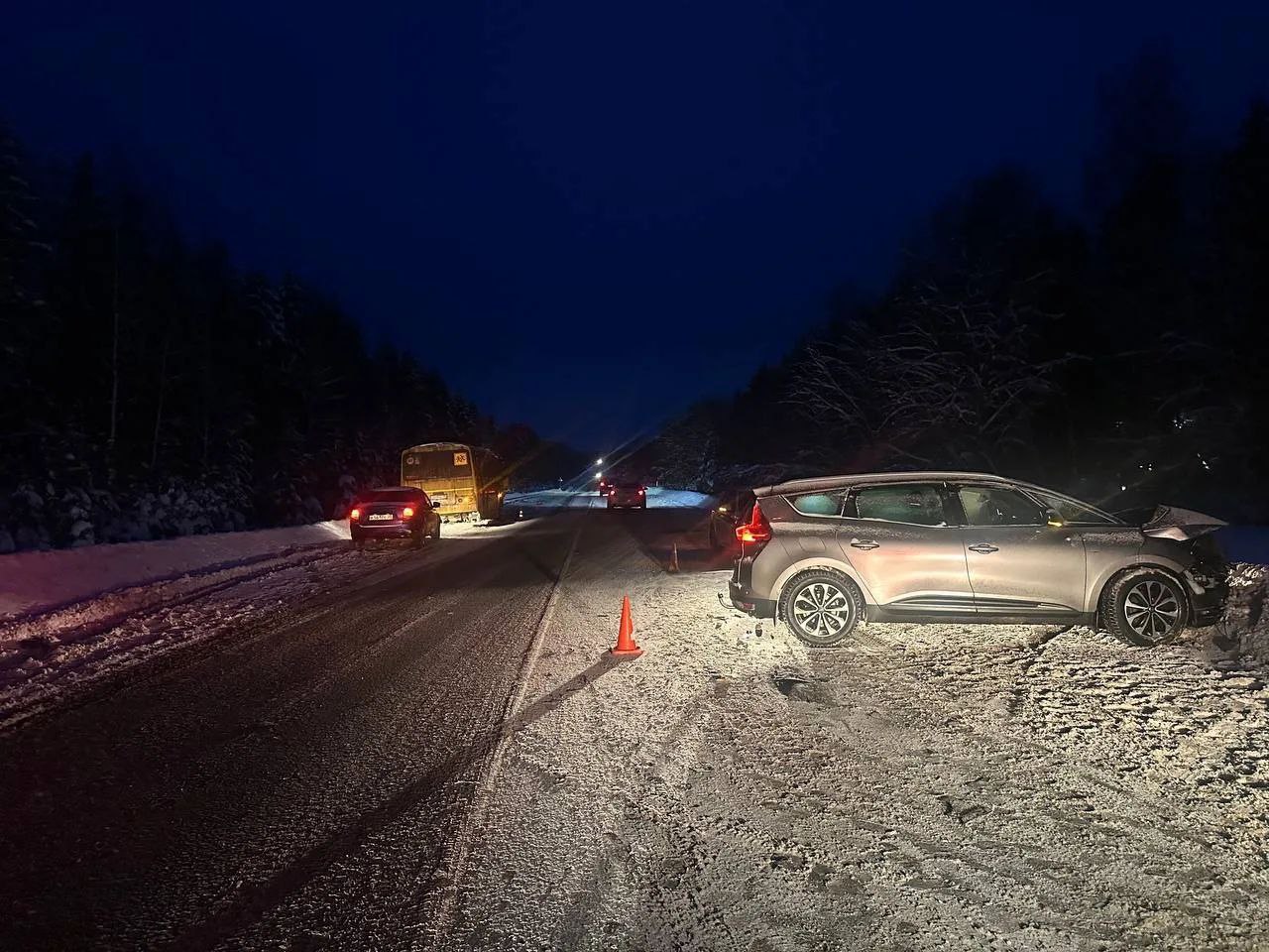 ДТП произошло сегодня в 15:52 на 13-м км автодороги Вологда – Ростилово. По предварительной информации, водитель, женщина 1985 г.р., управляя автомобилем «Рено», выезжая из села Первомайское на автодорогу Вологда – Ростилово в сторону Вологды, при перестроении не уступила дорогу школьному автобусу ПАЗ под управлением мужчины 1971 г.р., который двигался в прямом направлении без изменения траектории движения, в результате чего произошло столкновение «Рено» и автобуса.