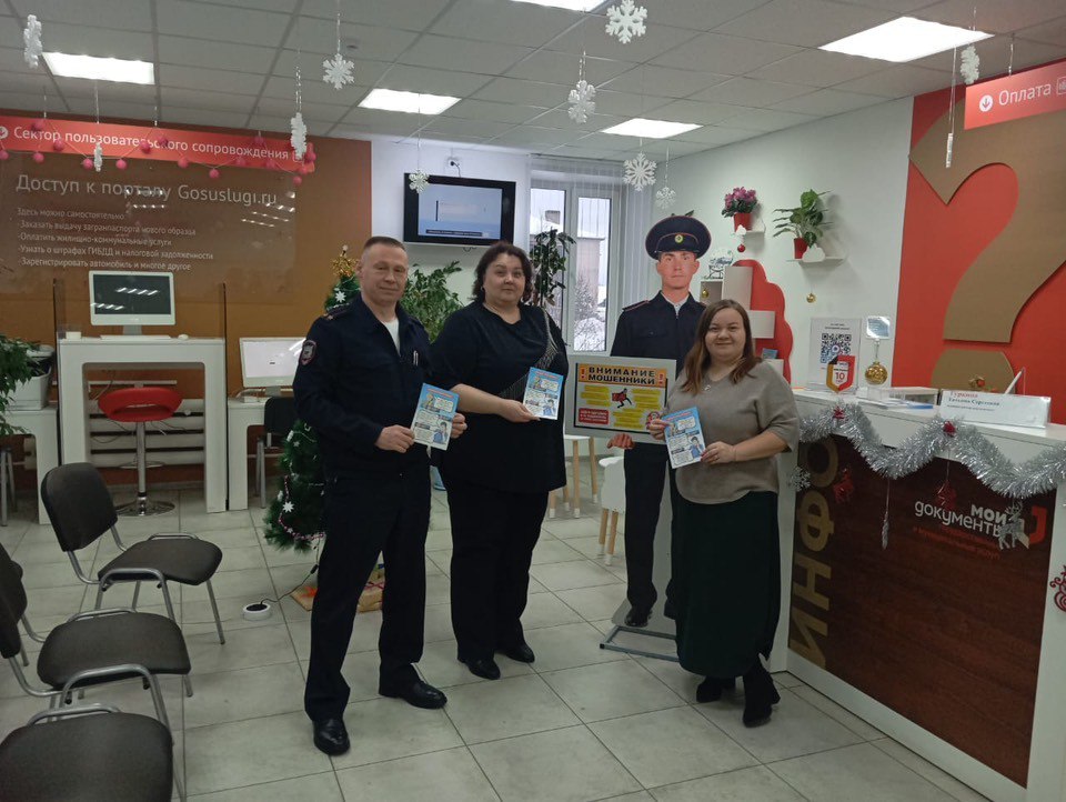 Также в целях информирования большего количества граждан в здании МФЦ был установлен стенд полицейского с буклетом по профилактике мошенничества.