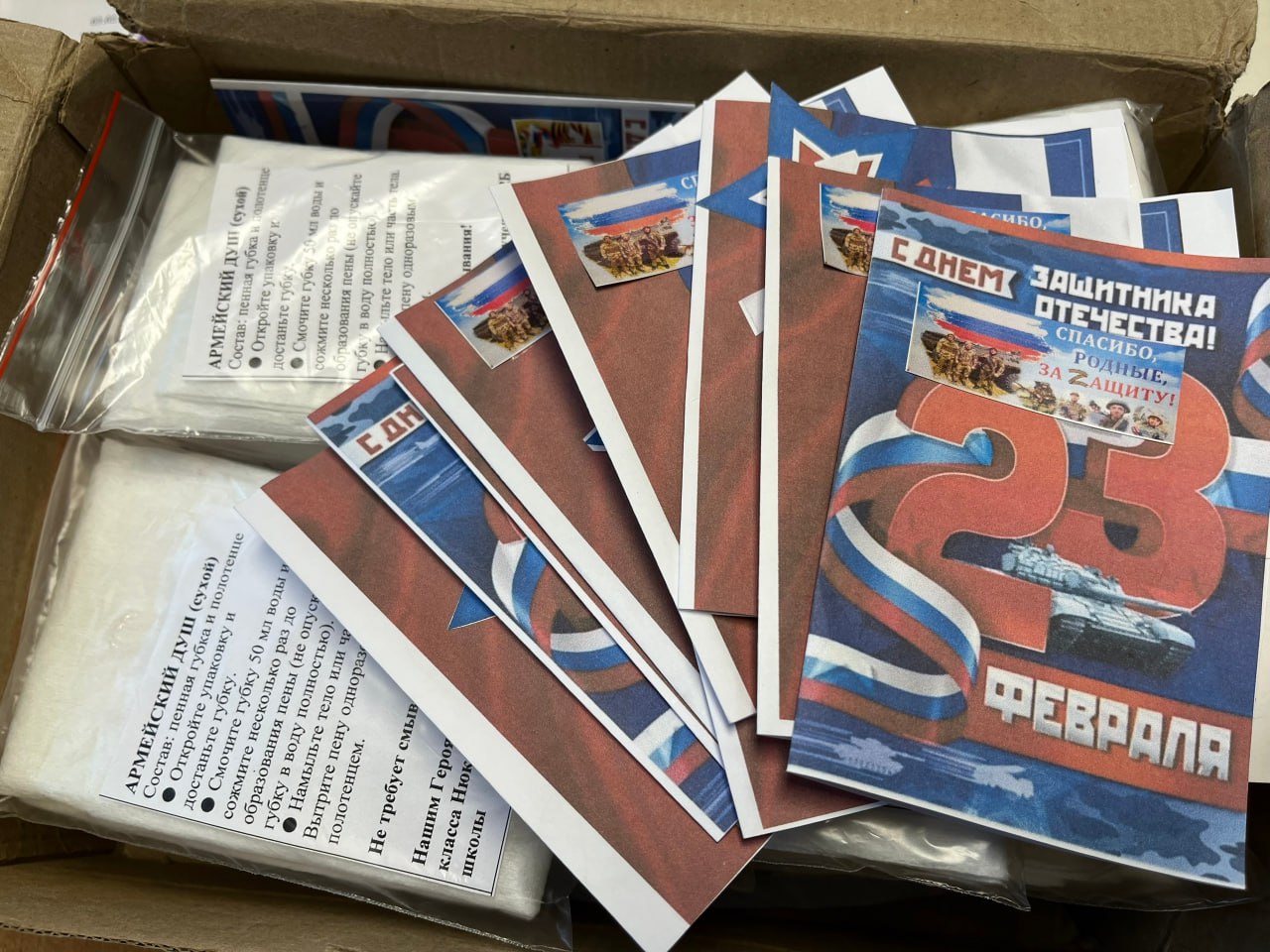 Ребята изготовили самостоятельно маскировочные сети, «сухой душ» и конечно же поздравительные письма-открытки, которые изготовили своими руками, где написали самые теплые и добрые пожелания защитникам.