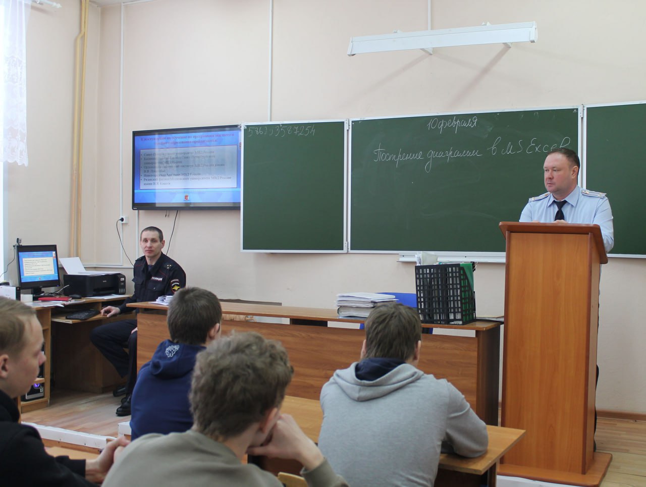 Урок профессионального ориентирования провели для студентов филиала Тотемского политехнического колледжа заместитель начальника-руководитель ГРЛС Александр Колтаков, специалист направления профессиональной подготовки Алексей Селяков и представитель Общественного совета Павел Карачев. Гости рассказали ребятам о полицейских профессиях, возможности получения высшего образованиях в вузах системы МВД, преимуществах такого обучения и основных требованиях к кандидатам на службу в правоохранительные органы, а также раздали информационные памятки.