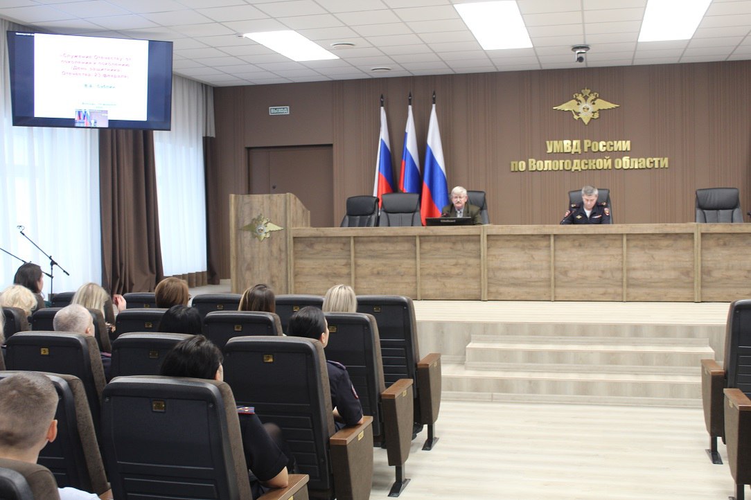 Сегодня в рамках Единого дня государственно-правового информирования сотрудники УМВД России по Вологодской области приняли участие в лекционном занятии на тему «Служение Отечеству: из поколения в поколение (День защитника Отечества, 23 февраля)».