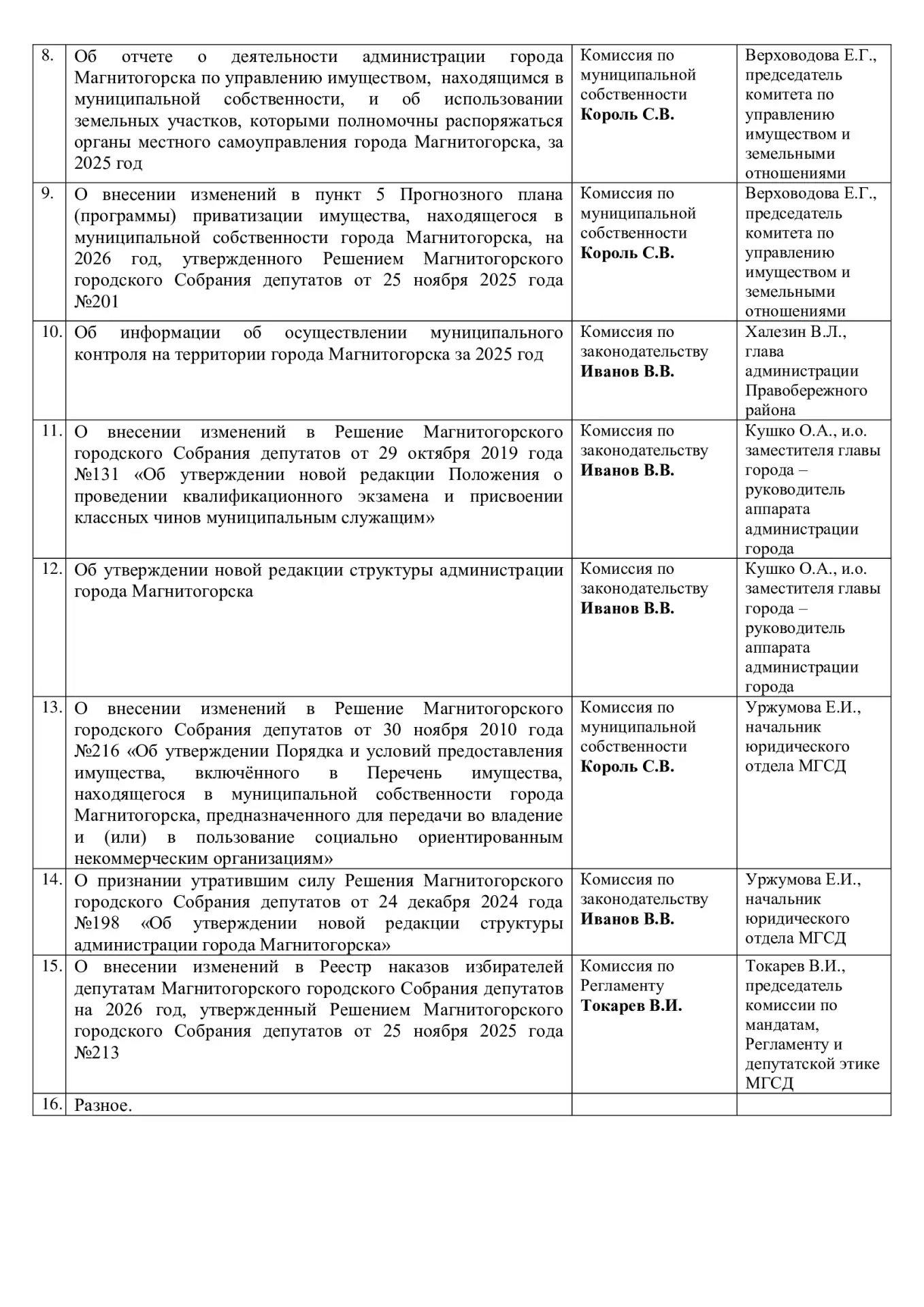 В рамках контрольных полномочий депутатами будут заслушаны итоги по управлению имуществом, находящимся в муниципальной собственности, по озеленению города, а также по осуществлению муниципального контроля за 2025 год.