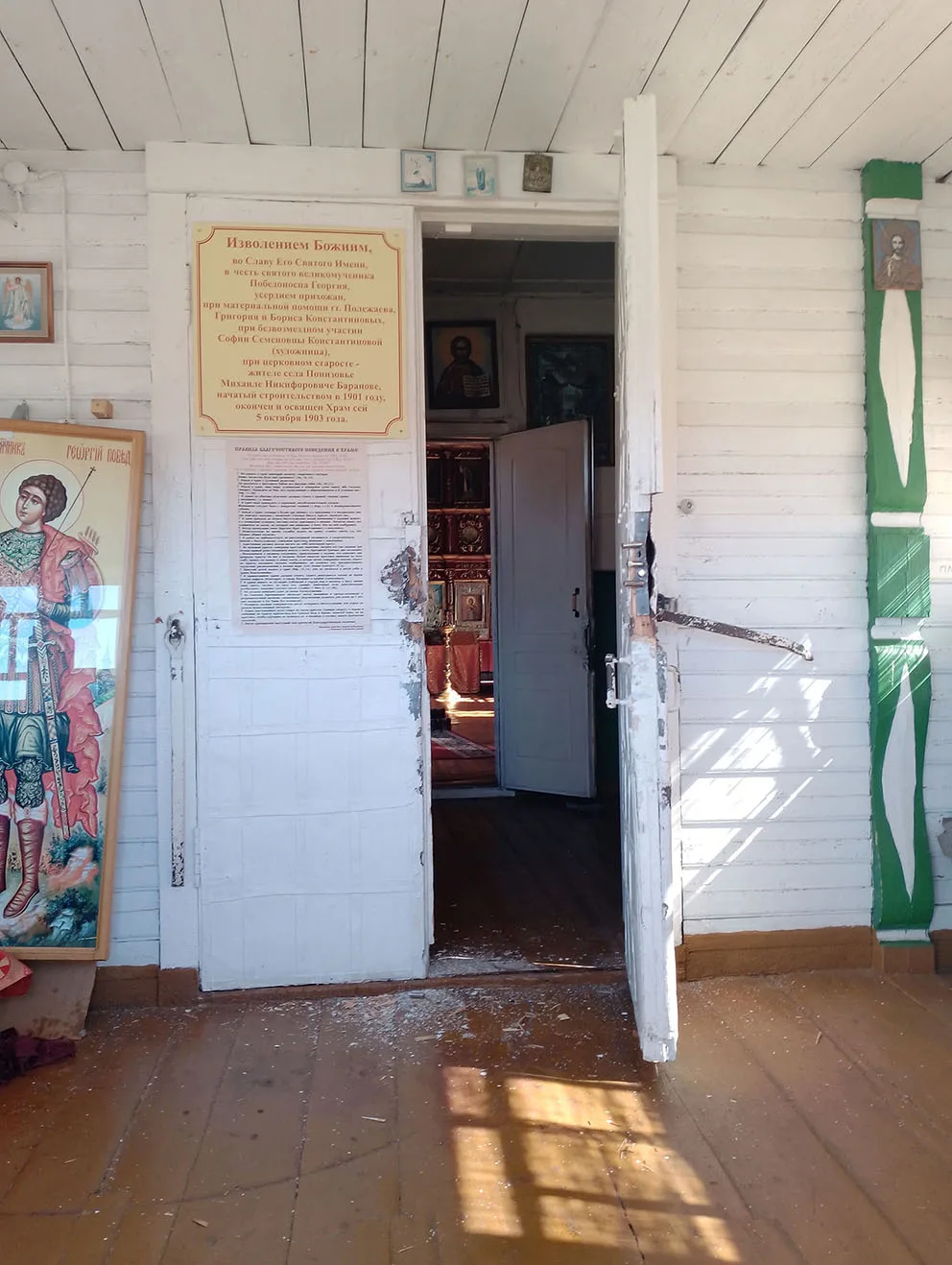 Прибывшая на место следственно - оперативная группа установила, что незаконное проникновение в храм совершено путём срыва запорных устройств с входных дверей. Похищены иконы и церковная утварь.