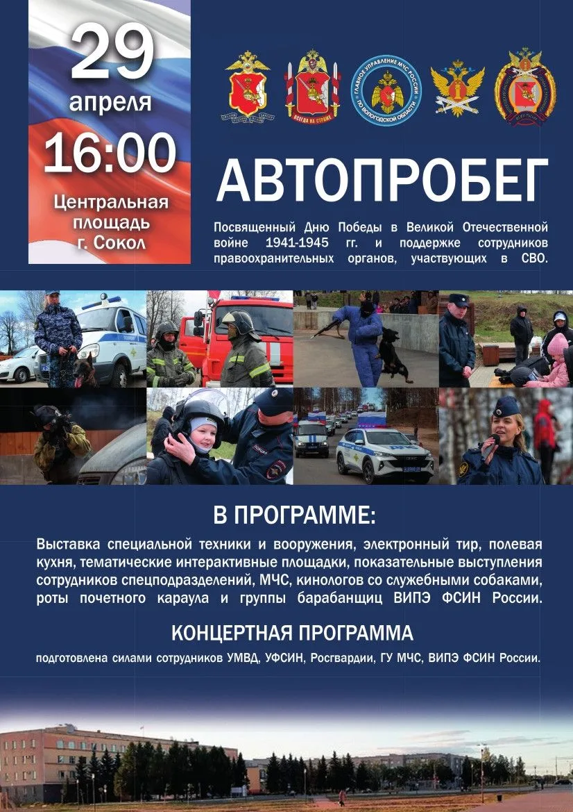 29 апреля на центральной площади Сокола состоится интересное действо. Представители силовых министерств покажут свою технику, вооружение, проведут занятия на интерактивных площадках, устроят работу полевой кухни, покажут праздничный концерт.