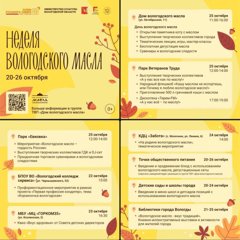 Масштабная программа, посвящённая одному из самых узнаваемых и вкусных брендов, пройдет в рамках проекта «Осень Русского Севера».Финальным событием станет День вологодского масла 25 октября. "В Доме вологодского масла проводятся лекции...