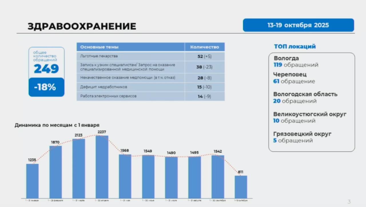 Количество обращений по теме здравоохранения снизилось на 18%. Вопрос по льготным лекарствам остается на контроле.