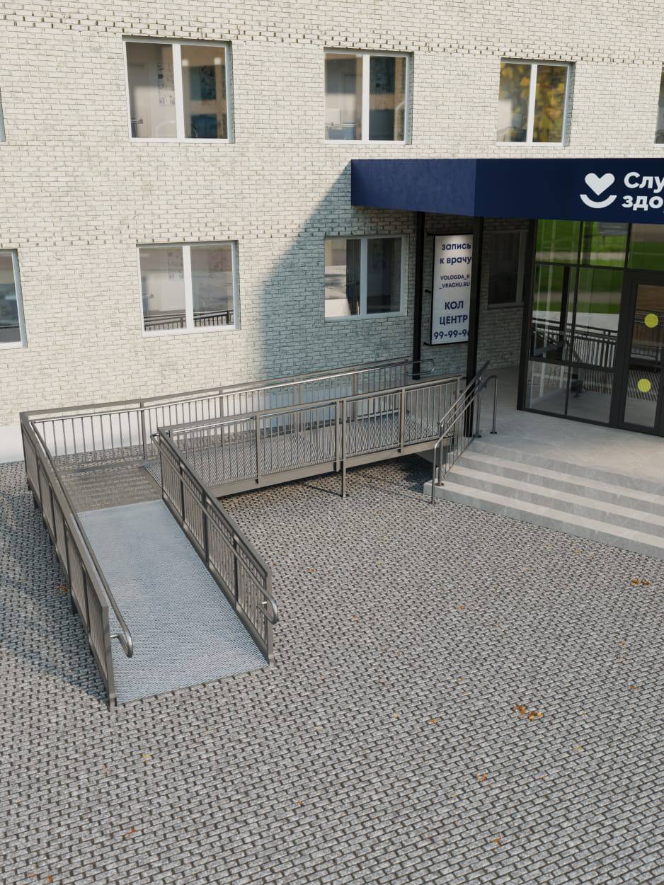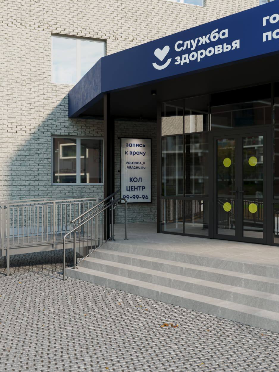 Дизайн-проектвходнойгруппы разработан вологодскими специалистами по федеральному брендбуку. Главная цель — организовать функциональное, безопасное и красивое пространство для пациентов. Монтаж крыльца и благоустройство прилегающей территории уже завершены на 80%.