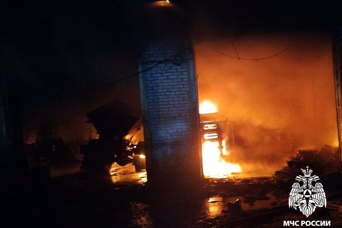 На место прибыли пять единиц техники и десять специалистов МЧС. По данным пресс-службы регионального ведомства, пожарные потушили огонь на площади 384 квадратных метра. Пламя успело повредить внутреннюю отделку, деревянные конструкции кровли, имущество, а также автомобили: два КАМАЗа и три МАЗа.