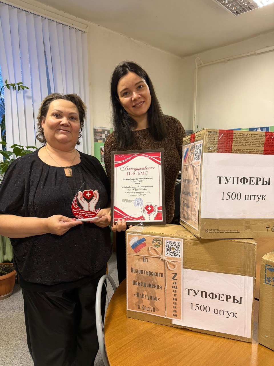 Накануне Нового года депутат ЗСО Любовь Царева посетила волонтёрское объединение «Плетуньи» из Кадуйского округа, изготовившее свыше 4000 тупферов — изделий, которые спасают жизни российских воинов в госпиталях зоны СВО.