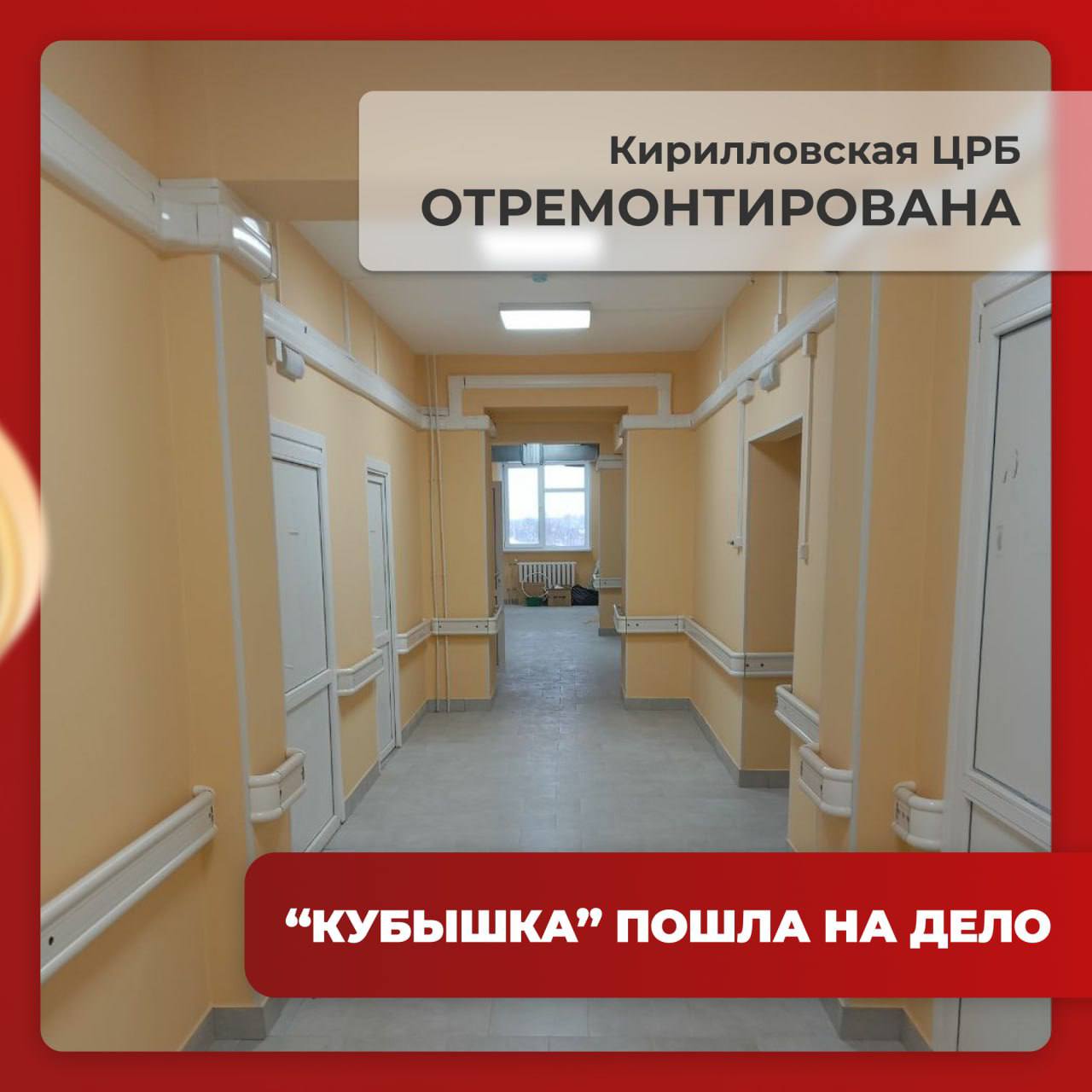 В прошлом году завершили масштабный капитальный ремонт Кирилловской ЦРБ. Обновили оба этажа, от приёмного отделения до хирургии, закупили современное оборудование и благоустроили территорию.