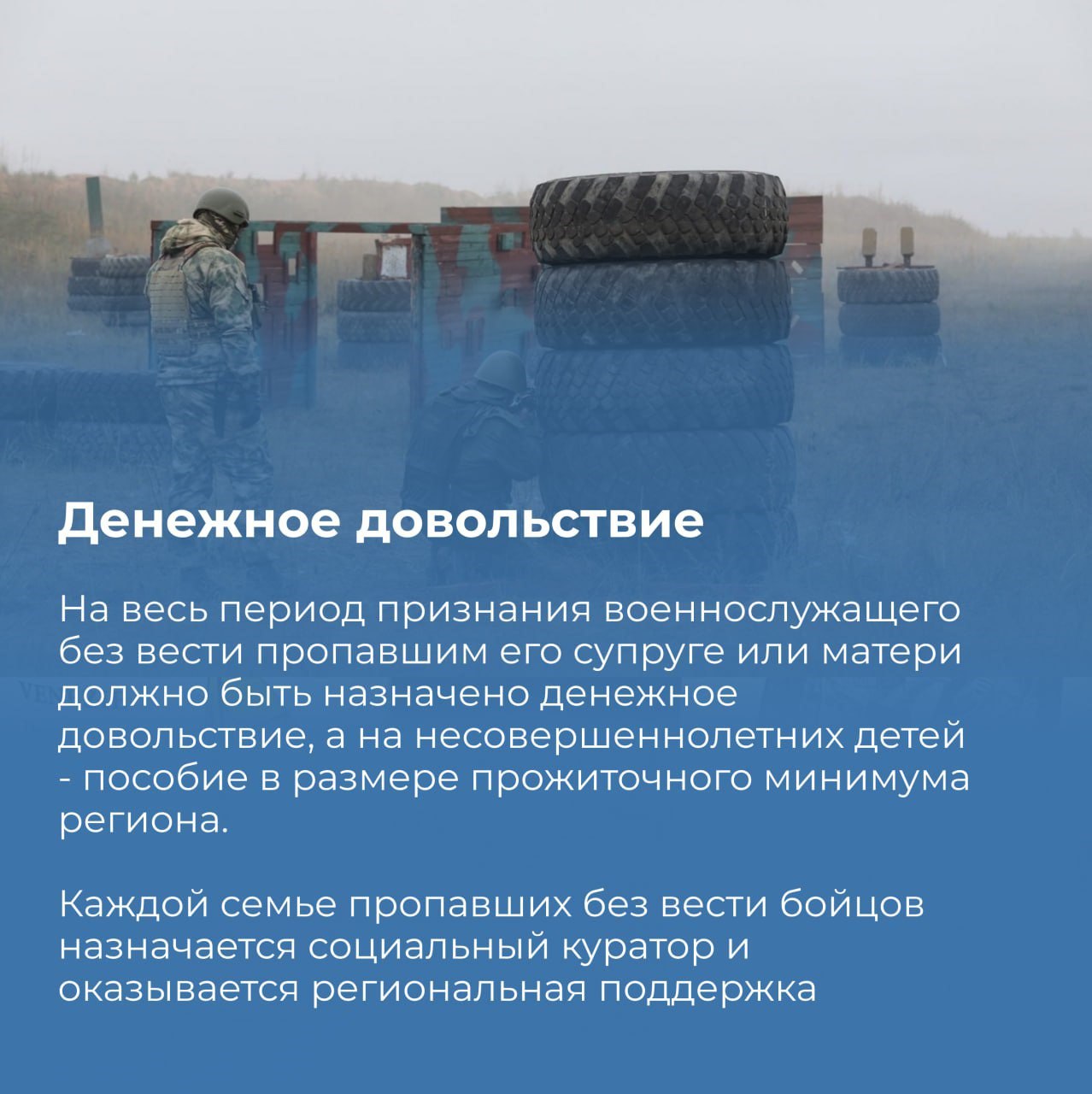 Напомним, что на весь период признания военнослужащего без вести пропавшим его супруге или матери должно быть назначено денежное довольствие, а на несовершеннолетних детей — пособие в размере прожиточного минимума региона. Подробнее том, что делать родственникам без вести пропавшего бойца, представлено в карточках.