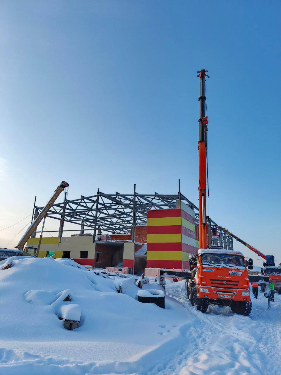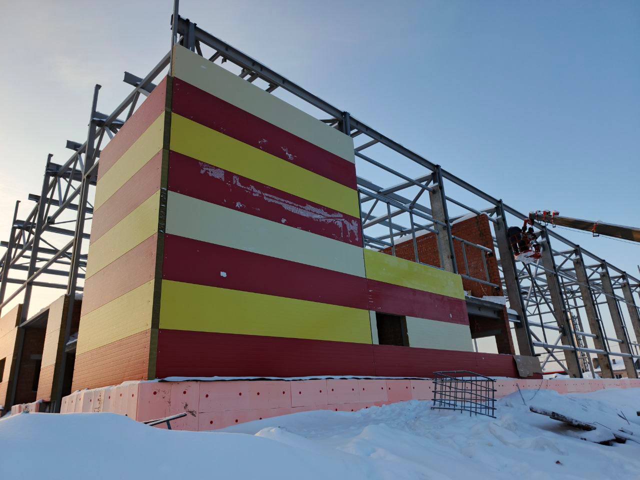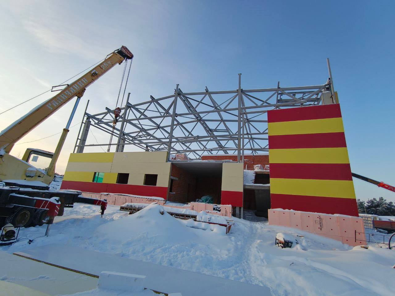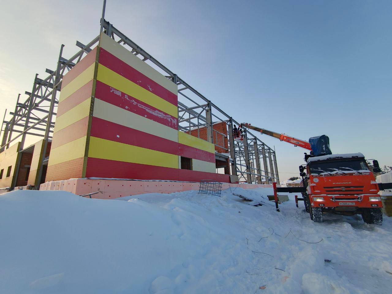 Специалисты продолжают монтаж стеновых и кровельных сэндвич-панелей — это строительные плиты, состоящие из двух прочных внешних слоев и легкого утеплителя между ними. Они быстро монтируются и одновременно служат и отделкой, и утеплением здания.