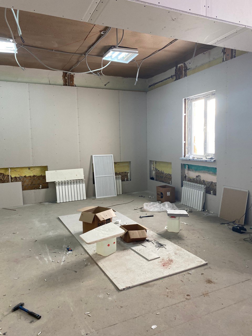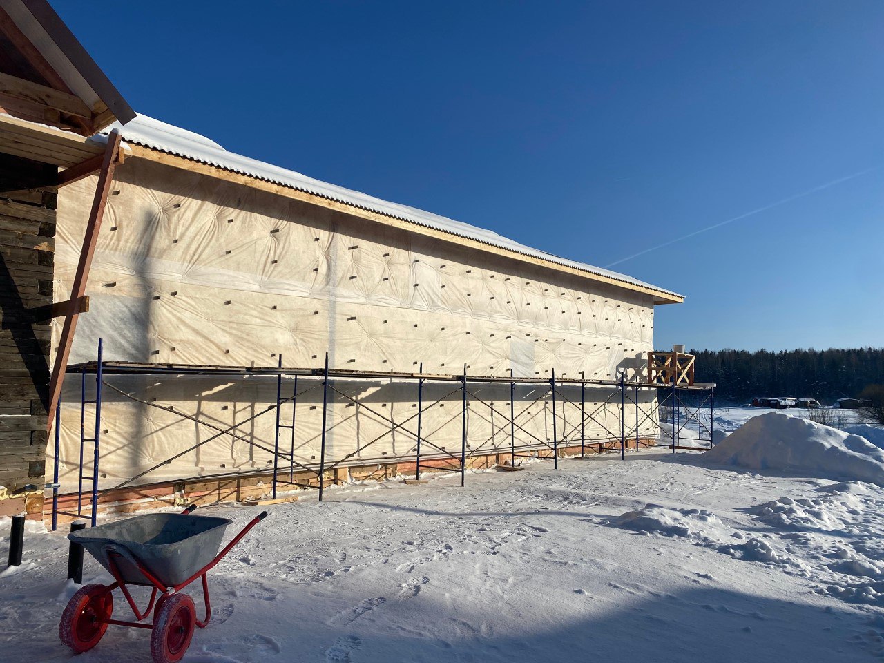 Снаружи здание готовят к облицовке металлическим сайдингом, а внутри ведутся работы по выравниванию стен под последующую отделку гипсокартоном. На объекте ежедневно трудятся 10–12 специалистов.