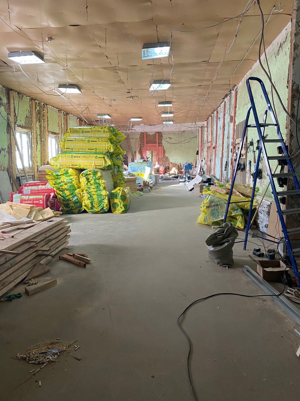 Алексей Маслов посетил объект и оценил ход работ. Подрядная организация завершает монтаж новой кровли, подготавливает основание под напольные покрытия и проводит утепление потолочных перекрытий.