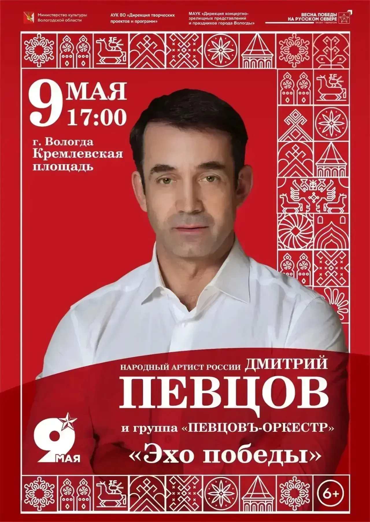 Актёр и музыкант с оркестром «Певцовъ-оркестр» даст патриотический концерт «Эхо победы» на Кремлёвской площади. Начало в 17:00.