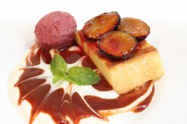 3. Для подачи на тарелках выложить по 2–3 ложки йогурта, сверху полить сливовым соусом и сделать разводы зубочисткой для красивого оформления. Готовую запеканку украсить карамелизованными сливами. Дополнительно можно добавить шарик мороженого и веточку свежей мяты для пикантной ноты.