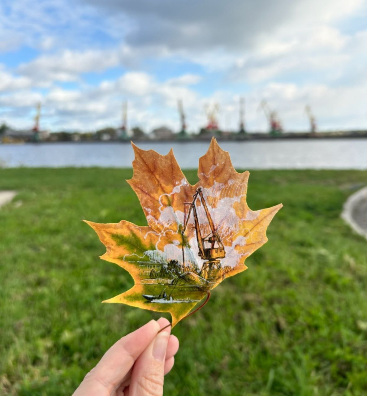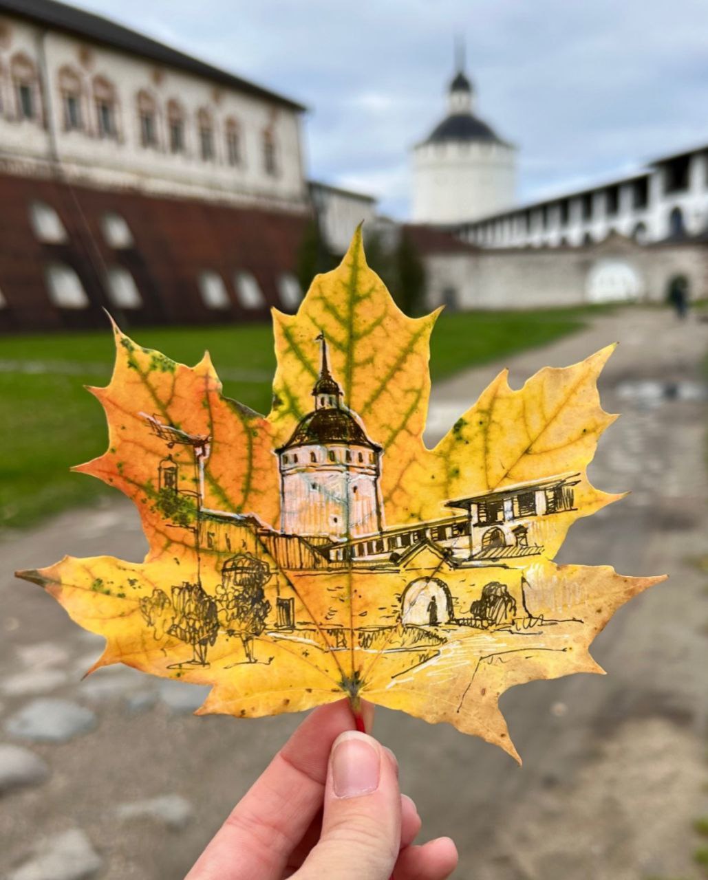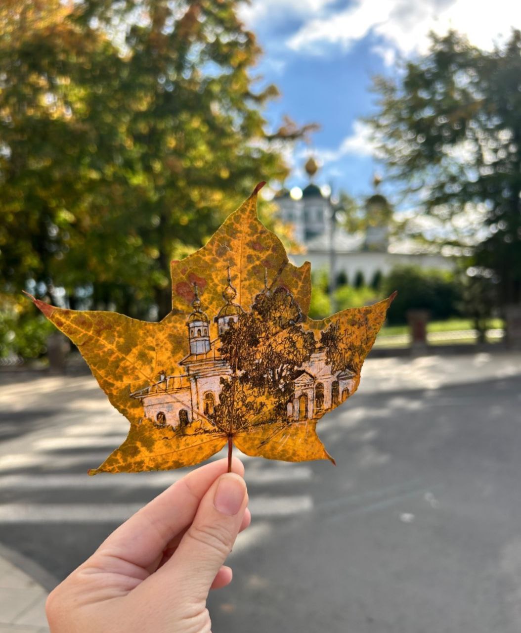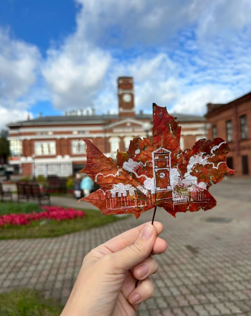 Искусство момента... Художница из Череповца Екатерина Крылова рисует известные виды Вологодской области на кленовых листьях...