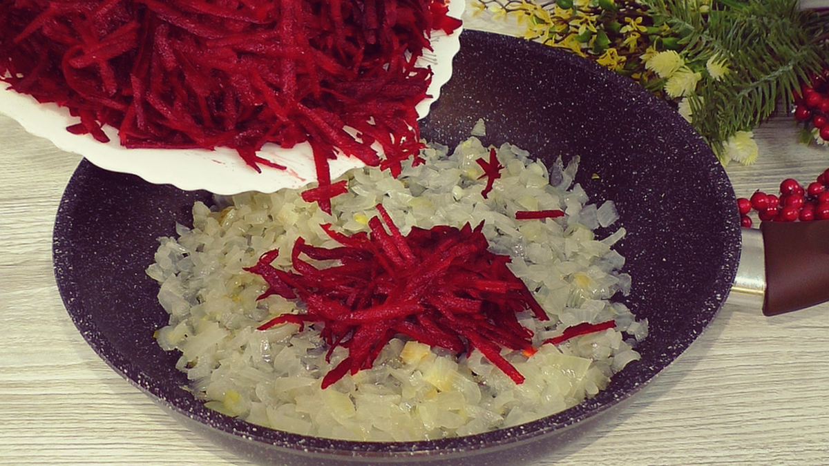 Начните с обжаривания лука на разогретом растительном масле до тех пор, пока он не станет прозрачным. В это время свёклу и морковь можно натереть на крупной тёрке и добавить к луку.