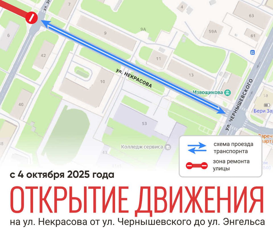 С 4 октября для проезда будет доступен участок улицы Некрасова - от улицы Чернышевского до Энгельса.