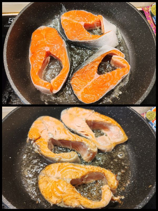 Для начала необходимо обжарить стейки форели с обеих сторон до появления золотистой корочки. Сковороду можно сбрызнуть оливковым маслом для лучшего вкуса — хотя это не обязательно.