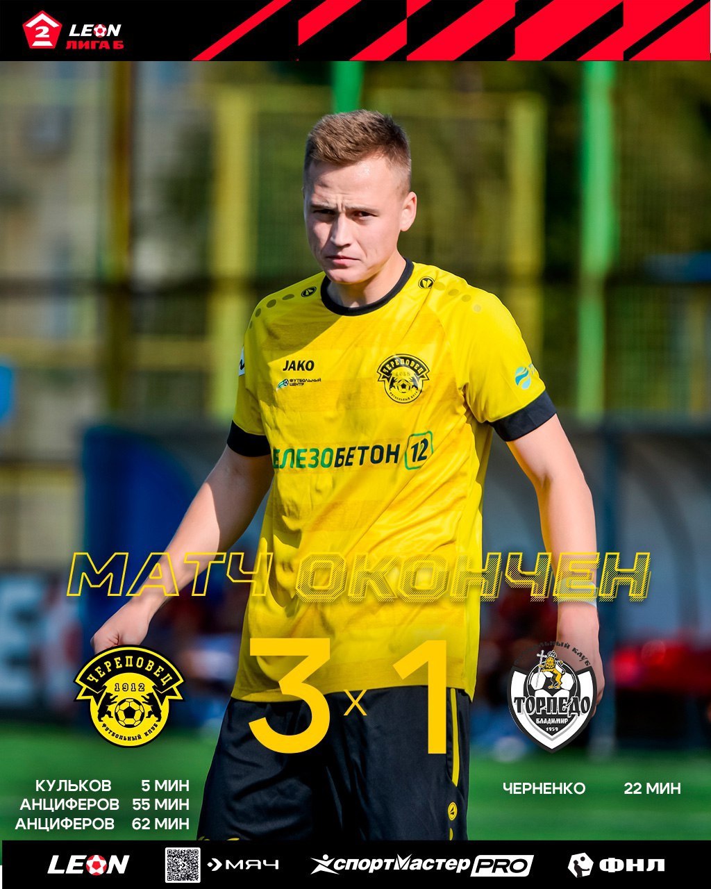 Дебютант Второй лиги Б – ФК «Череповец» на своем поле взял верх над владимирским «Торпедо». Первый тайм завершился вничью – 1:1. В составе желто-черных отличился на 5-й минуте Кирилл Кульков. Во второй половине встречи футболист клуба из Вологодской области Илья Анциферов забил в ворота владимирцев два гола. Итог встречи 3:1.