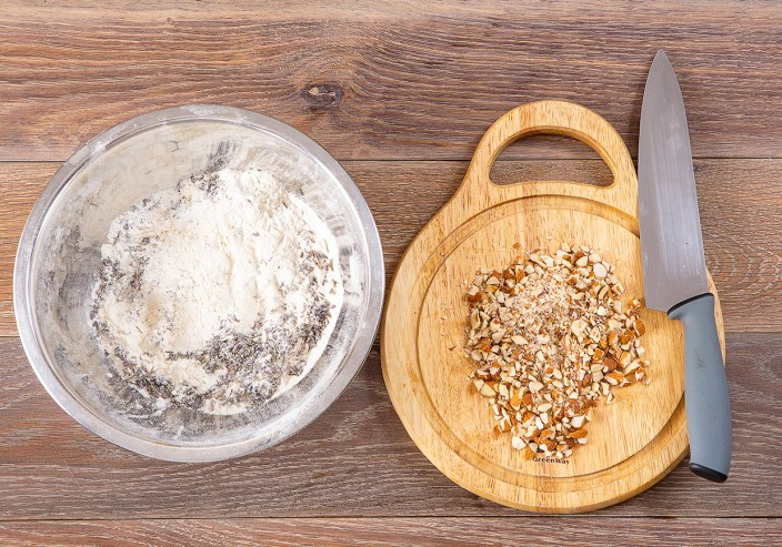 1. Подготовка теста. Разогрейте духовку до 180°C. Осторожно покрошите миндаль. В глубокой миске просейте 240 г муки вместе с разрыхлителем, добавьте лаванду, миндаль и щепотку соли. Все ингредиенты тщательно перемешайте.