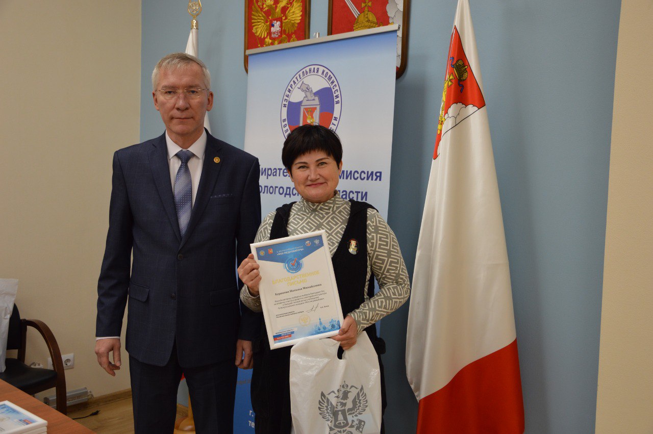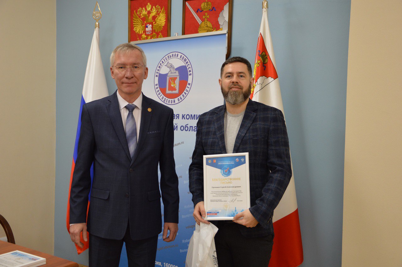 Председатель облизбиркома Денис Зайцев вручил благодарственные письма Российского фонда свободных выборов членам жюри Третьего Всероссийского конкурса «Мои медиавыборы» Наталье Бураковой, главному редактору сетевого издания «35ТВ» и Сергею Громыко, доценту кафедры русского языка, журналистики и теории коммуникаций Вологодского государственного университета