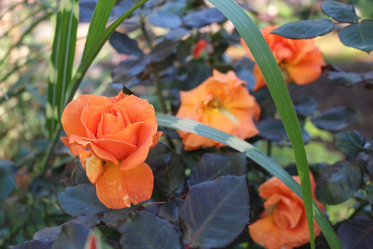 Чайно-гибридная "Black Bakkara" также не прекращает цвести, несмотря на то, что она чувствительна к грибковым заболеваниям. Интересно, как дождь оставляет свои следы на лепестках, придавая они особую атмосферу осеннего сада. А вот флорибунда "Orange Meilove" рассветает, словно вспышка огня, на фоне яркого шалфея "Mainacht". Эта цветовая игра создает великолепный контраст, и стоит лишь насладиться её красотой.