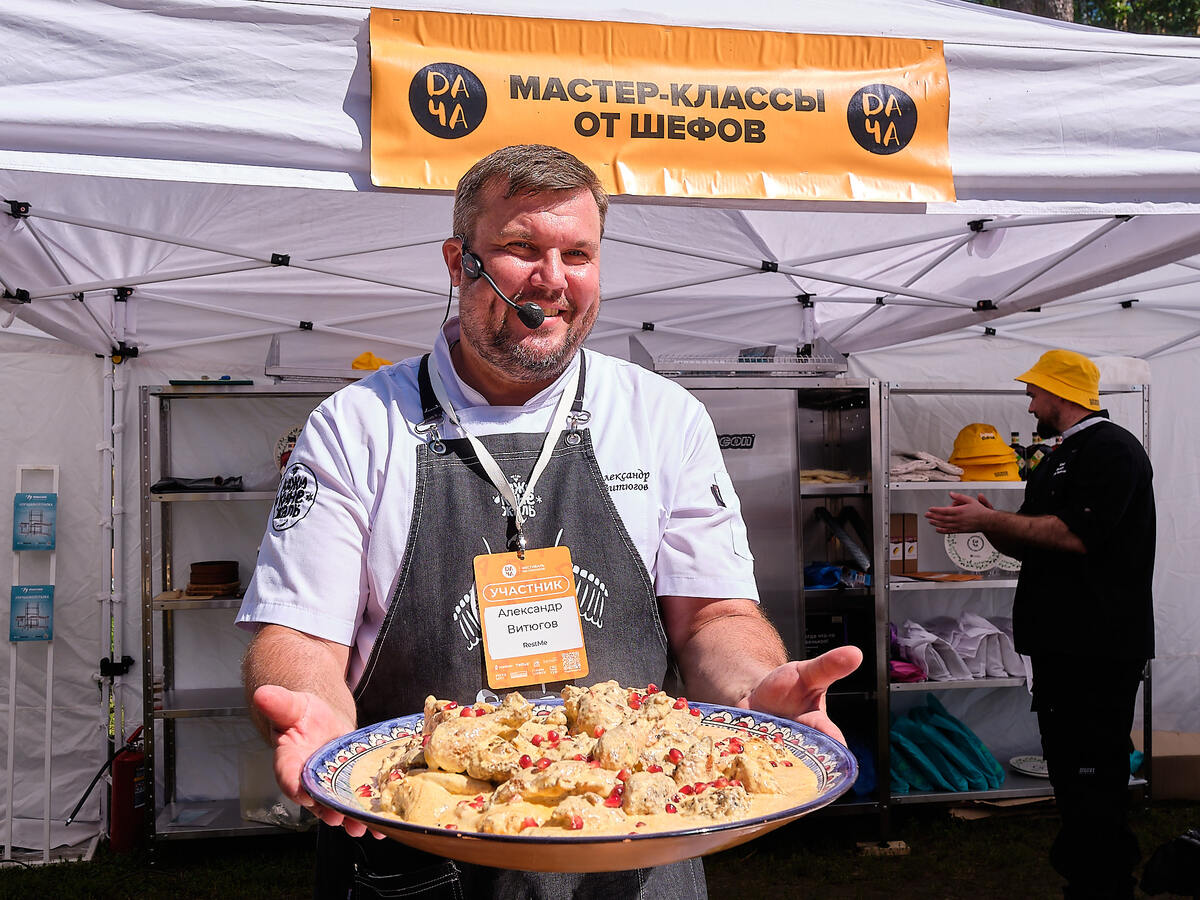 На недавно прошедшем фестивале рестораторов "Дача" шеф-повар знаменитой сети грузинских ресторанов "Аджикинежаль" Александр Витюгов представил свою оригинальную версию популярного грузинского блюда — чкмерули, который он приготовил с тайским соусом.