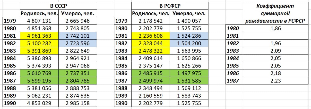 Цитата: В 1985-1988 гг. в СССР существенно снизилась смертность и повысилась рождаемость. Согласно официальным данным Госкомстата, за два полных года действия кампании – 1986 и 1987 – в Советском Союзе умерло на 245 тысяч человек меньше, чем в 1983-1984 годах. Еще более заметным стал рост рождаемости: в 1986-1987 годах родилось на 431 тысячу человек больше, чем в 1983-1984 годах (ист.: Демографический ежегодник СССР 1990 г., стр. 91; Демографический ежегодник СССР 1991 г., стр. 55). В РСФСР в годы кампании смертность снизилась на 10%, а рождаемость повысилась на 9%, в сравнении с предыдущим периодом. Важно отметить, что снижение смертности и повышение рождаемости в годы кампании произошли наперекор демографическим тенденциям последних лет – рождаемость в СССР и РСФСР ежегодно снижалась в 1984-1985 годах, но показала рост в 1986-1987 годах, а смертность ежегодно росла в 1983-1984 годах, но резко снизилась в 1986-1987 гг. (ист.: Андреев Е.М. 2016 г. Конечный эффект мер демографической политики 1980-х в России. Мир России, № 2, с. 68-97).