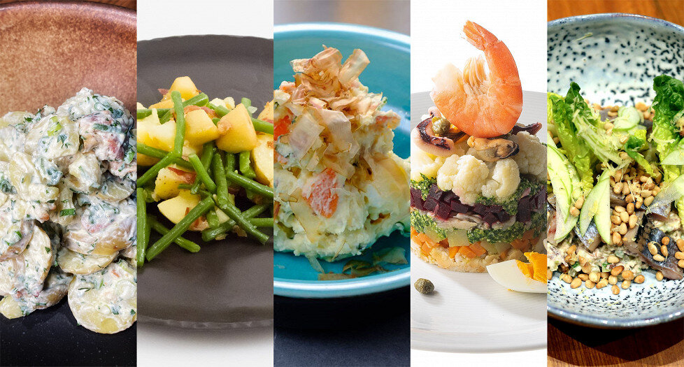 - Японская версия: Вдохновение для этого салата приходит от семьи Тидзуко Сирахамы, шефа «Ku: рамен-изакая-бар». В японском варианте используется айоли и азиатские мотивы, что добавляет новизны к классическому рецепту.