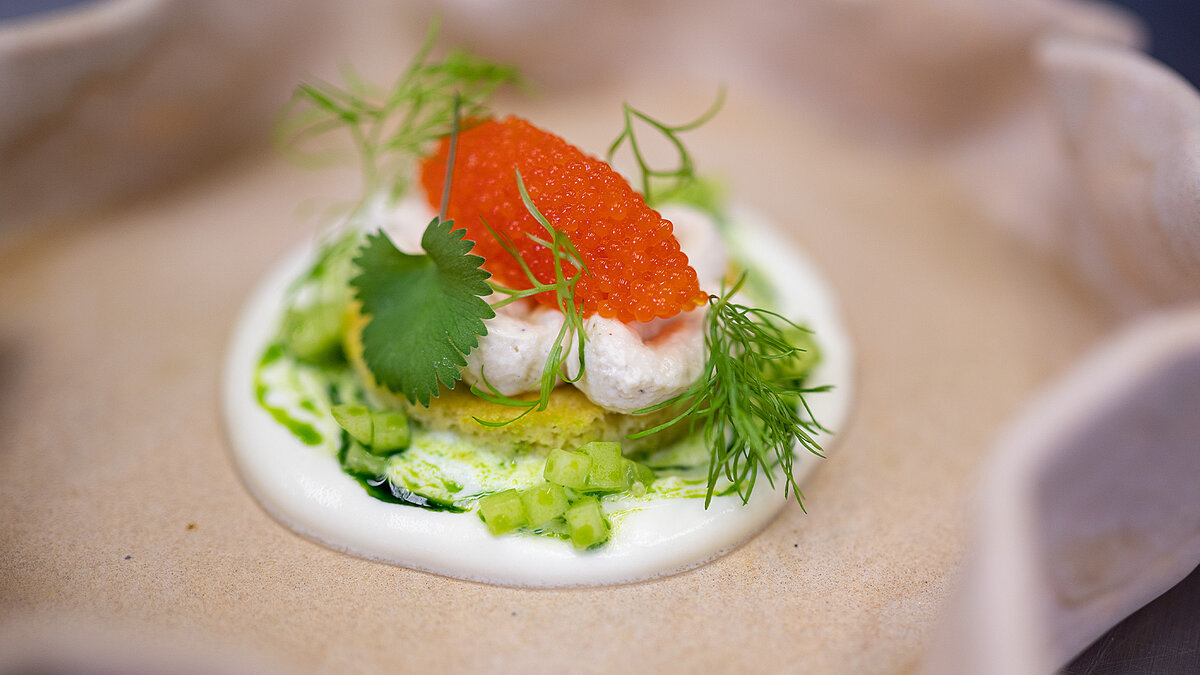 На тарелку выкладывают сметанно-огуречный соус, поверх которого аккуратно помещают картофельный круг, обильно смазанным картофельным кремом. Завершающим аккордом станут мелко нарезанные огурчики с укропным маслом и икра хариуса — это добавит не только вкус, но и визуальную привлекательность. Подобное лакомство не оставит равнодушными даже самых привередливых гурманов.