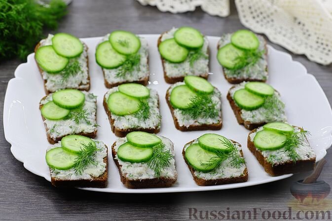 - Бутерброды с салом и огурцом – сытные угощения, которые подходят как для повседневного стола, так и для праздника. Паштет из сала с добавлением чеснока и зелени прекрасно сочетается с ломтиками свежего огурца на чёрном хлебе.