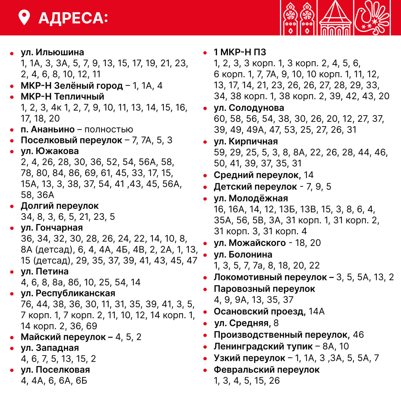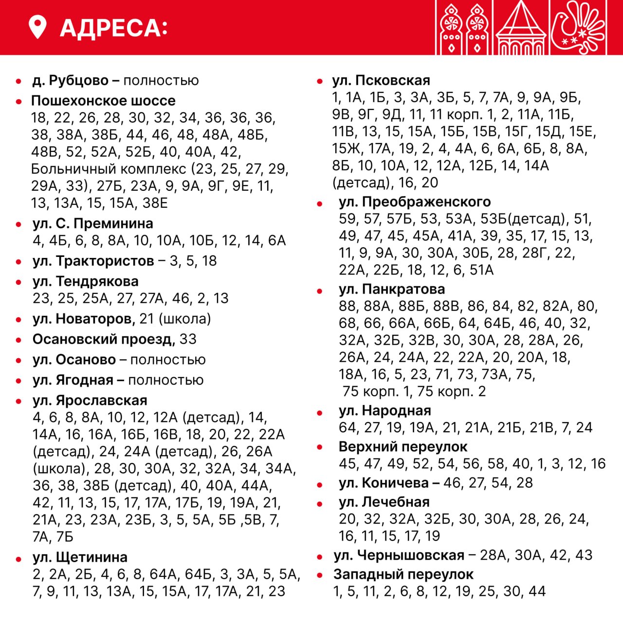 с 22:00 14 ноября до 22:00 16 ноября водоснабжение будет ограничено в ряде домов. Отключение связано с аварийно-восстановительными работами для устранения утечек на магистральных трубопроводах в районе улиц Клубова и Окружного шоссе.