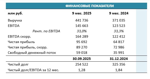 · Чистый долг по состоянию на 30 сентября 2025 года составил 254,5 млрд рублей. Соотношение чистого долга к показателю EBITDA (за 12 мес.) на конец отчетного периода снизилось до уровня - 1,28х.