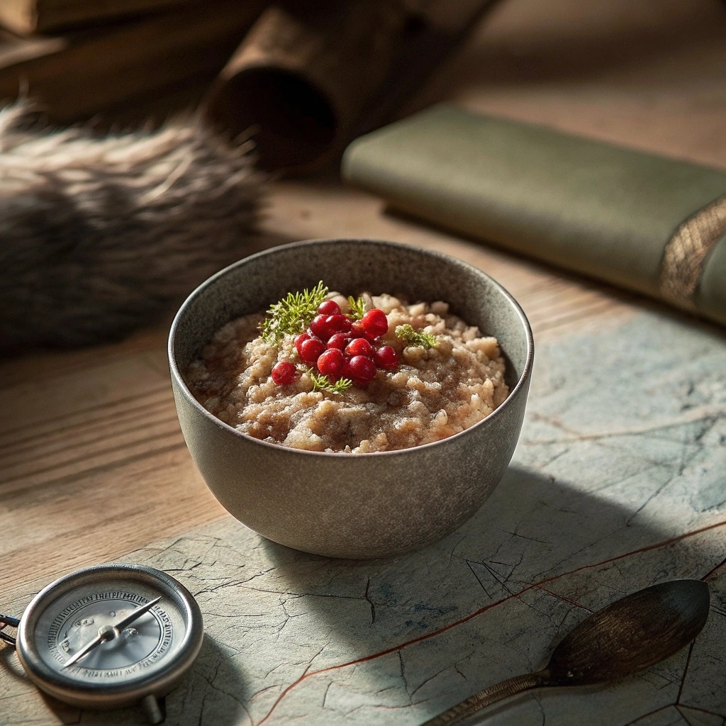 Одним из ярчайших примеров является овсяная каша на китовом или тюлений жиру. Эта сытная и питательная каша готовится с добавлением северного мха и ягод. Вот что необходимо для её приготовления: