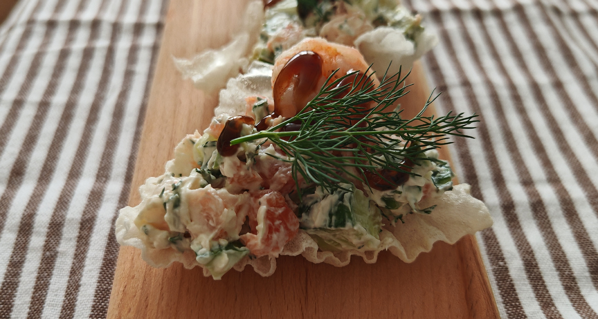 Когда все ингредиенты готовы, важно правильно оформить закуску. Начинку можно выложить на рисовые чипсы, украсив блюдо креветкой и посыпав укропом. Для пикантности можно добавить немного соуса терияки или окружить лимонными дольками и кунжутом. Эффектная подача на деревянной доске завершит впечатление.