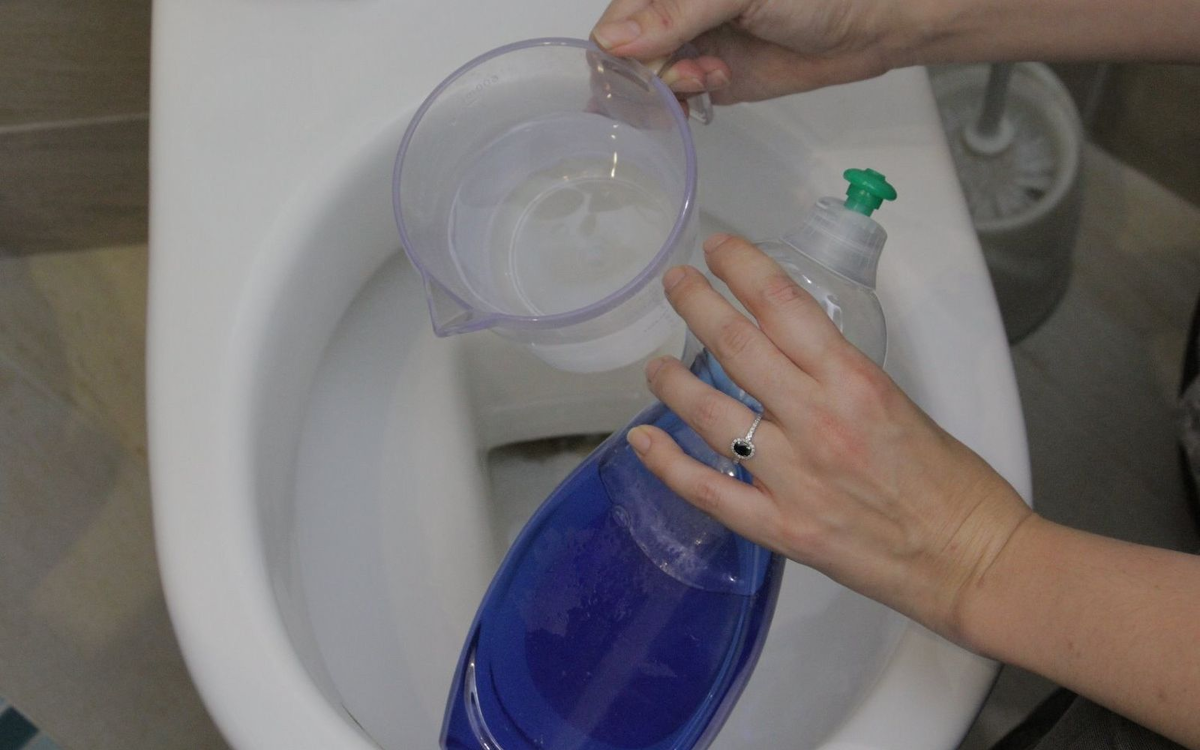 Для приготовления недорогого и эффективного чистящего средства потребуется всего два обычных ингредиента — жидкость для мытья посуды и горячая вода. Этот метод не только поможет избавиться от налета, но и сделает унитаз свежим и приятным на запах.