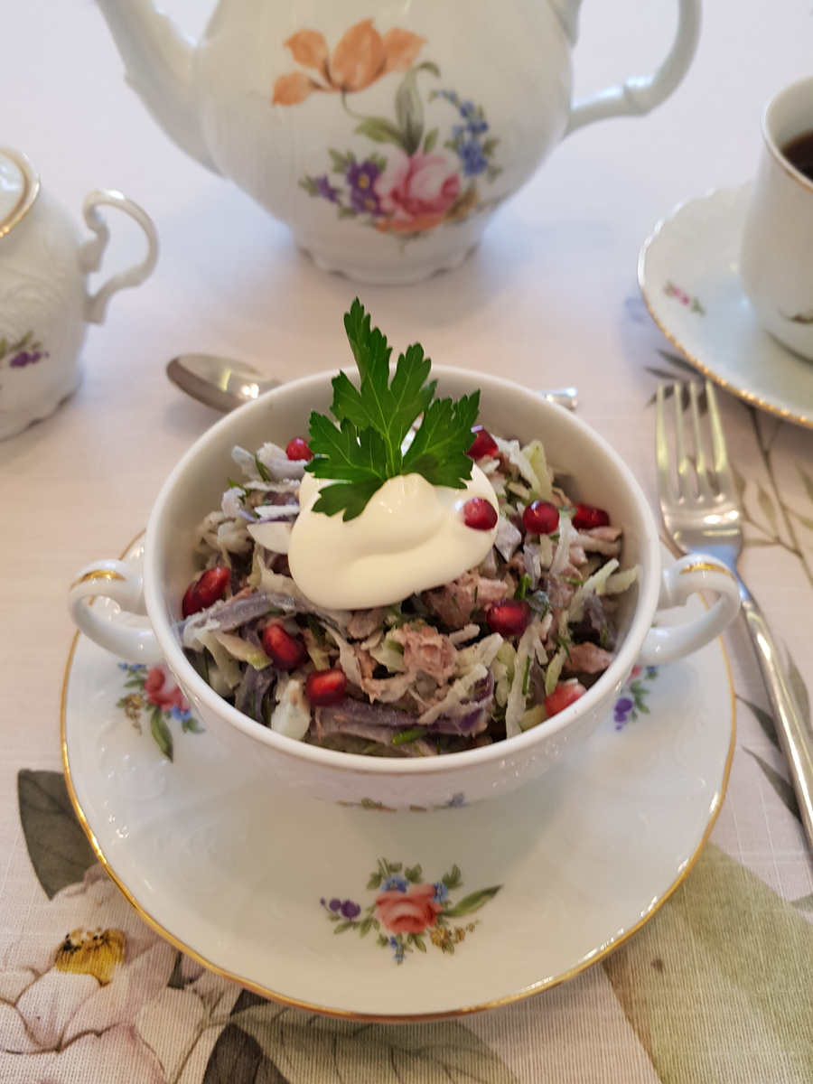 Подача салата происходит в красивых салатниках, где его украшают майонезом, зернами граната и свежей зеленью петрушки. Этот изысканный салат не оставит равнодушными никого и будет уместен на любой встрече!