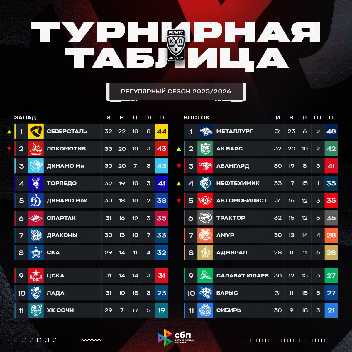 «Ак Барс» вернулся на второе место Востока, а «Северсталь» — на первое на Западе.